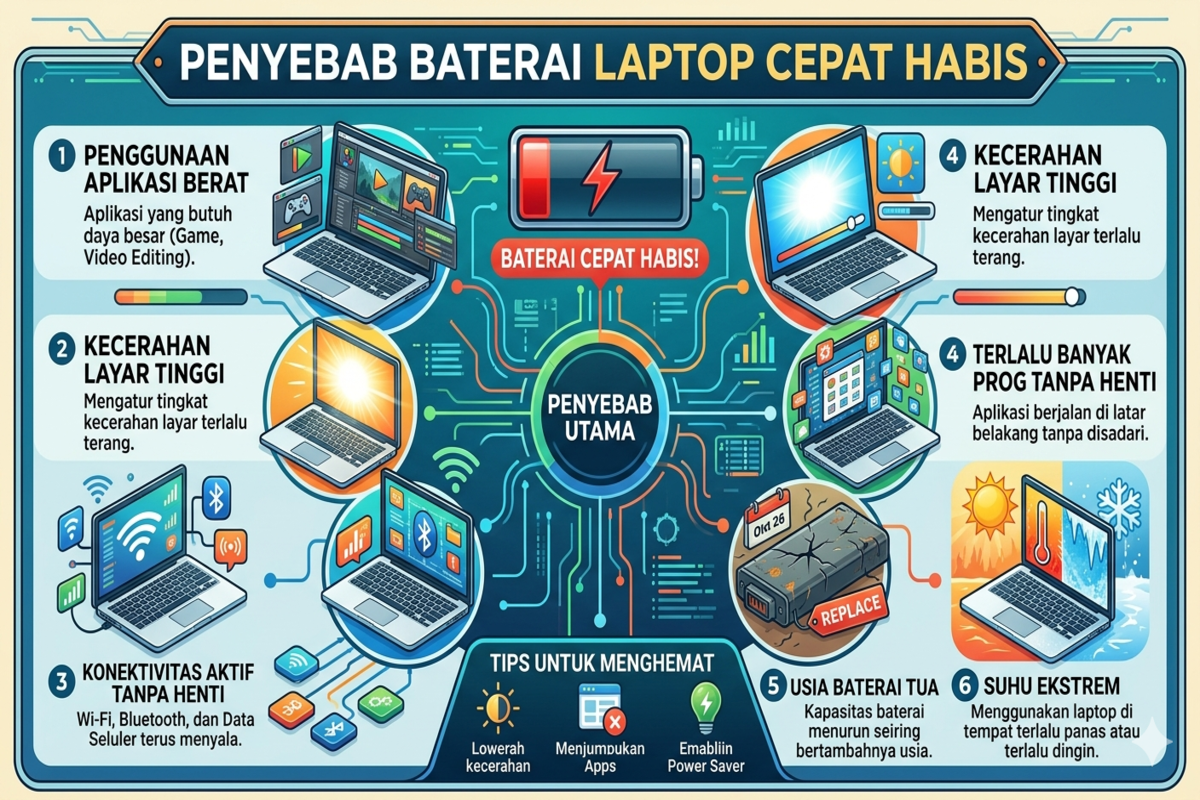 Masalah penyebab baterai laptop cepat habis sebenarnya bisa berasal dari berbagai faktor sederhana yang sering tidak disadari. Mulai dari kebiasaan penggunaan sehari-hari, pengaturan sistem yang kurang tepat, hingga kondisi hardware yang mulai menurun. Kabar baiknya, sebagian besar masalah ini bisa diperbaiki tanpa harus langsung mengganti baterai.